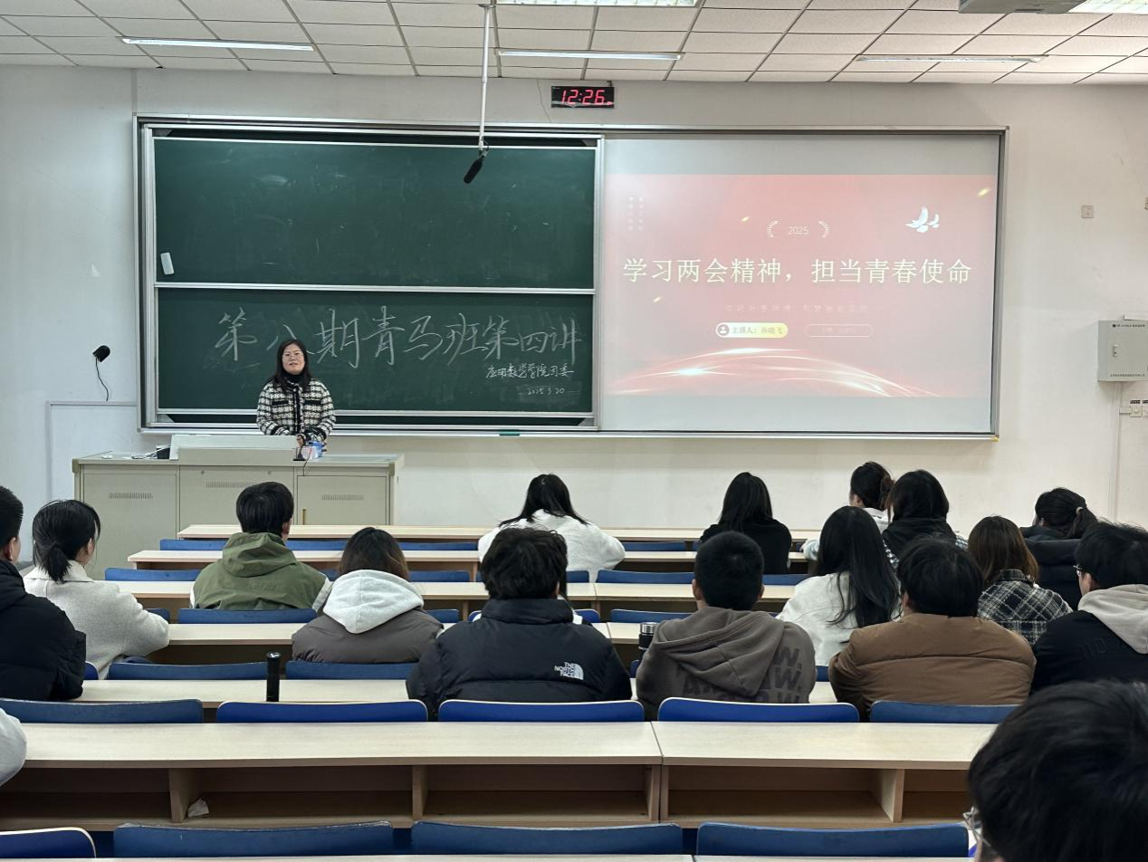 为深入学习贯彻两会精神,激励大学生担当青春使命,3月20日中午,学院第八期青马班第四讲“学习两会精神,担当青春使命”在仙林校区德正楼112教室举行。学院党委副书记孙晓飞老师主讲,学院全体青马班学员参加。