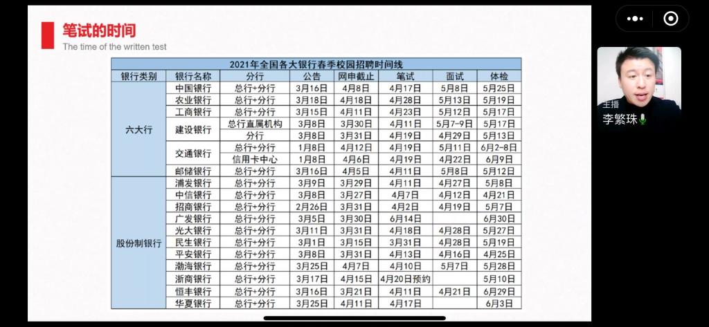 分享会从银行考试概述、网申策略指导、笔试技巧分享、面试高分策略等四个方面展开。首先,梅老师以三个字“稳、高、多”概括了在银行工作的优势,继而从“五类银行、一个招聘、两个时间、六个特点、四个岗位、五个流程”等方面事无巨细地讲述了银行招聘的细节。接着,他阐述了在网申中正确地填写实习信息、父母职位等的重要性,并通过一组真人照片的对比,说明了利用PS美化证件照的必要性。此外,梅老师还五大行的笔试题量,各大银行笔试考试的时间、面试答题技巧等问题进行了详细说明。最后,他针对“无领导小组讨论”和“半结构化面试”两种面试形式给出了一些行之有效的建议。