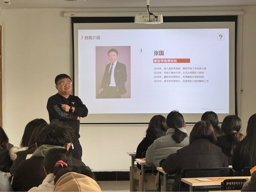 为帮助同学们了解教培行业就业形势,掌握企业需求,更好地抓住春招黄金期,3月6日下午,学院在仙林校区大学生活动中心113教室举办教培行业招聘宣讲会,邀请学而思张国老师和陈醉老师主讲,学院大三、大四部分学生参加。