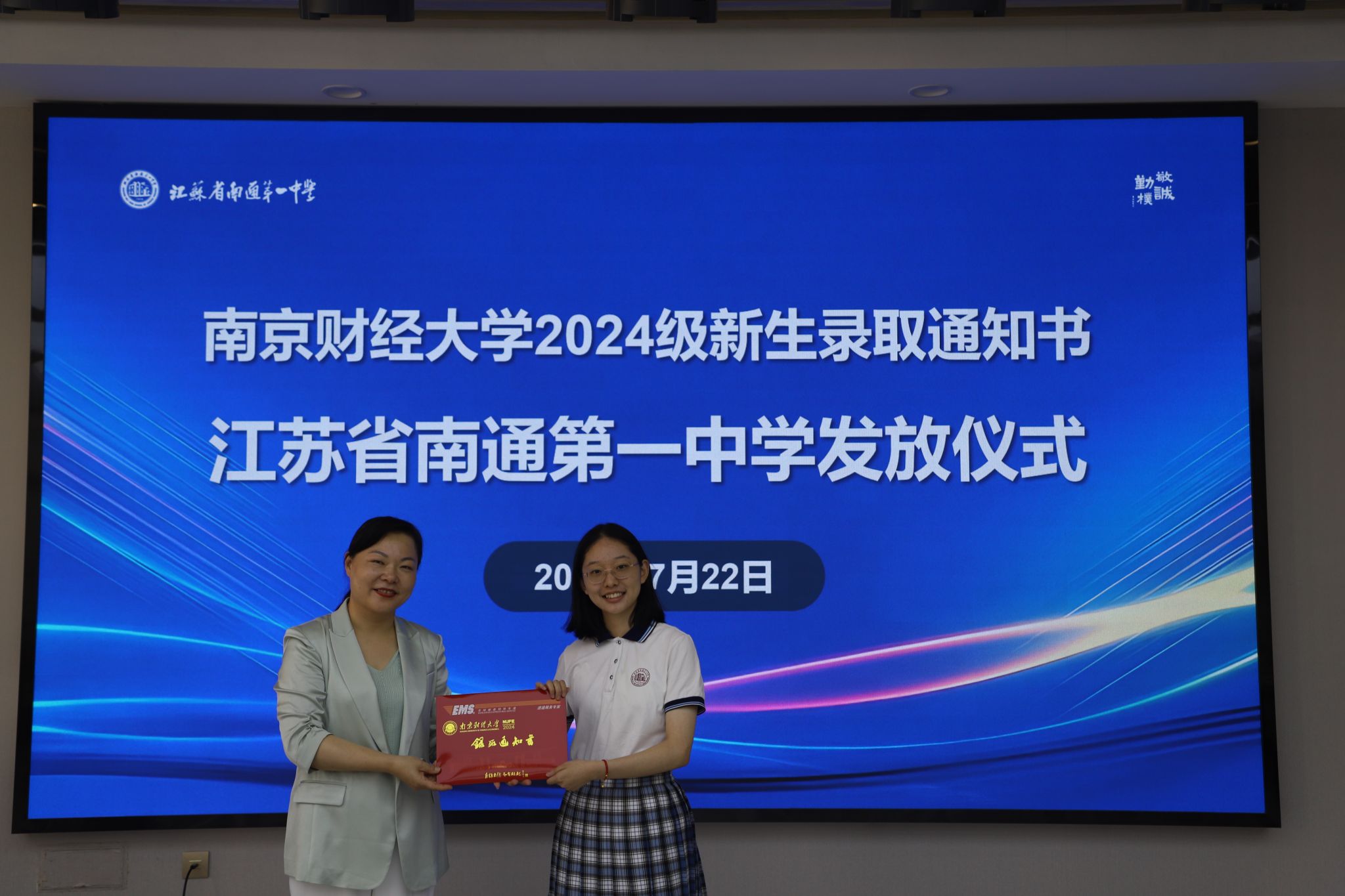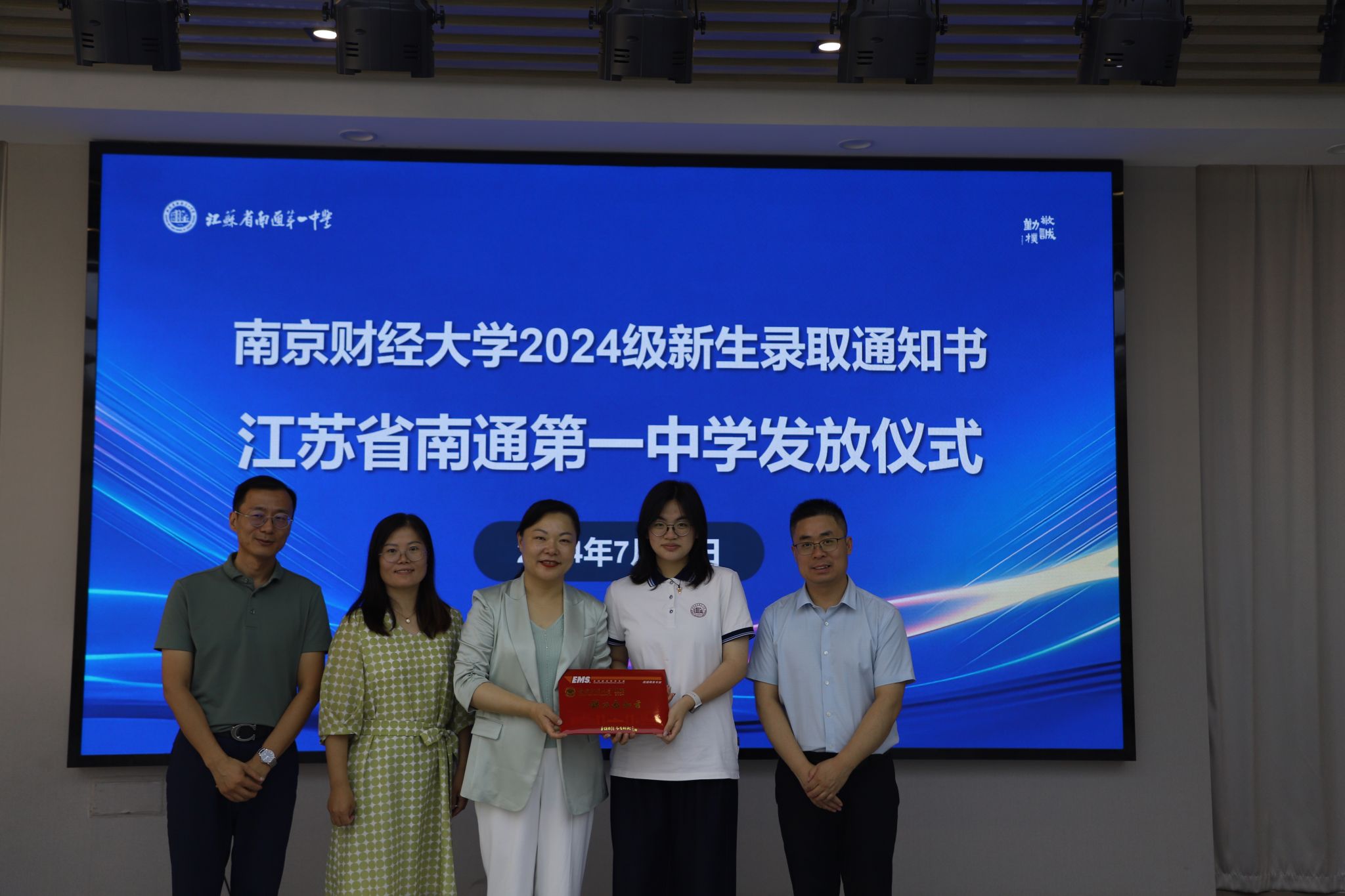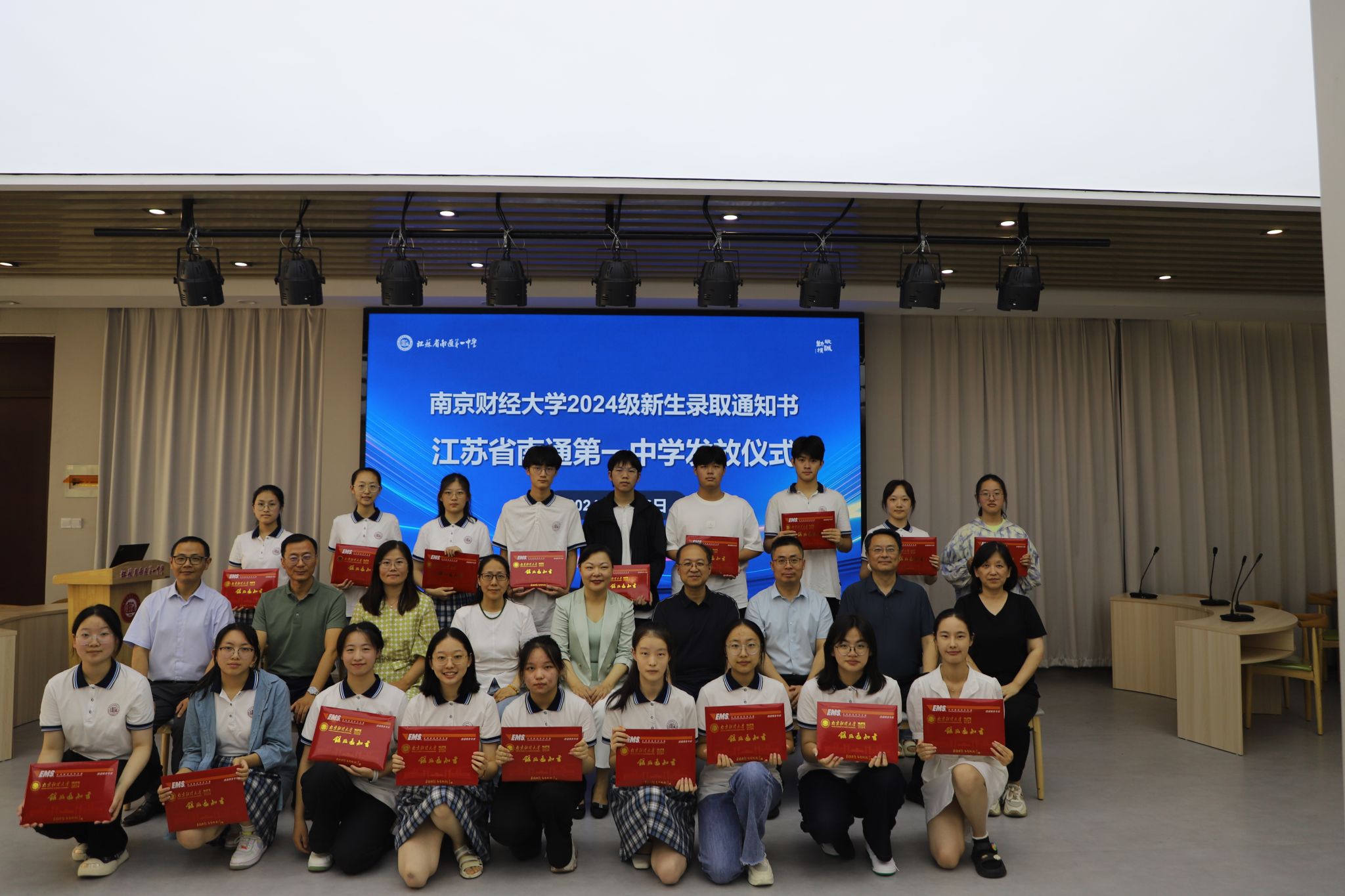 罗湘军校长致欢迎辞。他代表学校,对李煜副校长一行的到来表示热烈欢迎,对南财大校领导亲临南通一中颁发录取通知书表示衷心感谢。他介绍了南通一中百余年的发展历程,在“敬、诚、勤、朴”校训的指引下,形成了良好的校园文化。近年来,学校升学质量有了稳步提升,越来越多的学子能够考入南财大等重点高校。他殷切寄语新生,不负母校期待,在人生新的阶段大展宏图,勇敢逐梦。