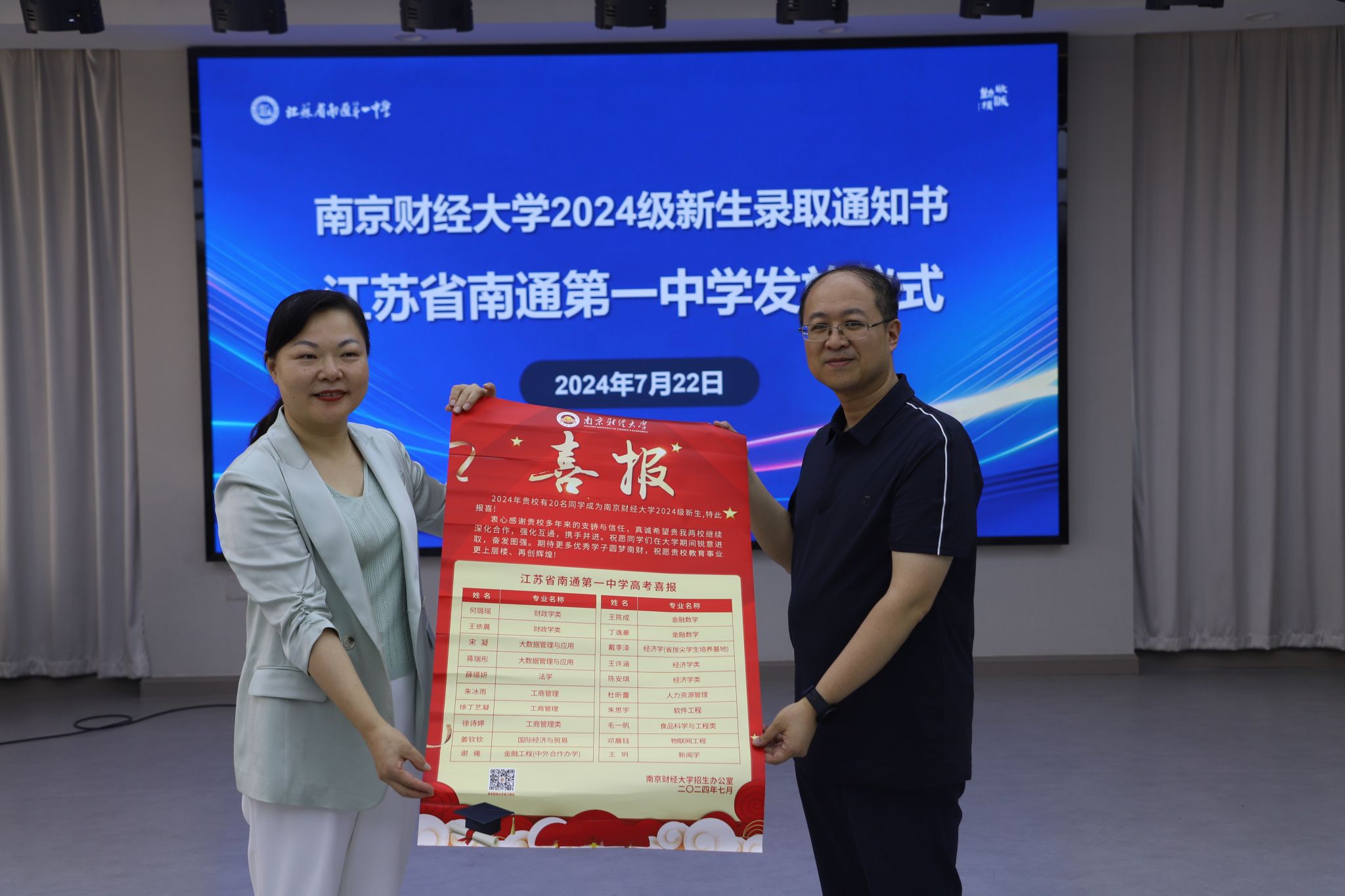 随后,方国昌院长宣布新生录取名单,李煜副校长赠送喜报,并亲手将录取通知书送到20名新同学手中。